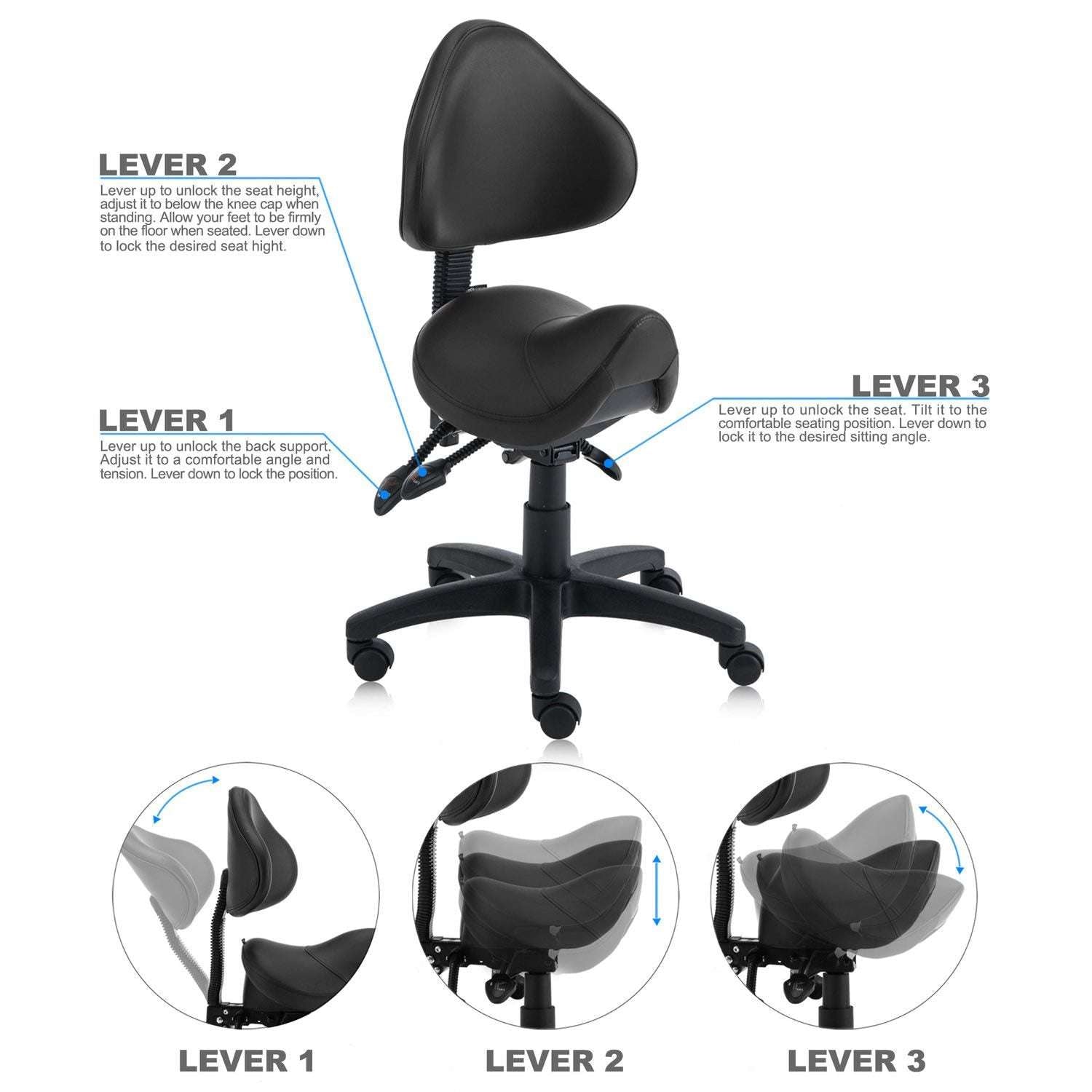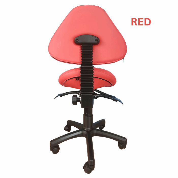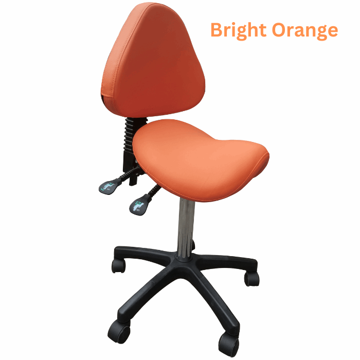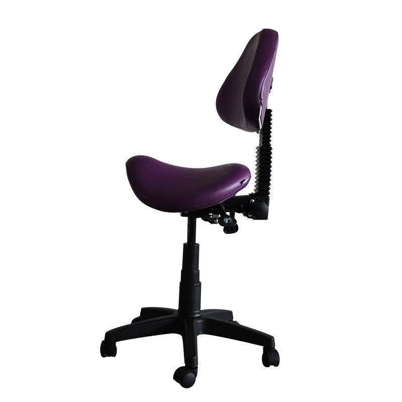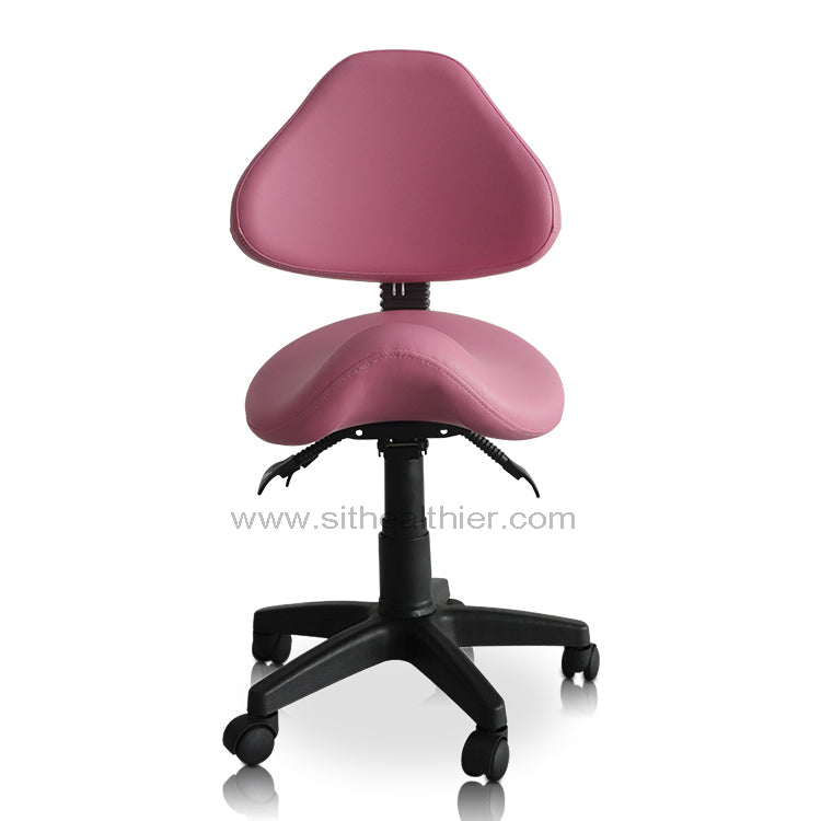 Three-way adjustable saddle stool with backrest. Reinforced nylon wheel casters for extra stability and easy-rolling on even surfaces. High density and high resilience molded foam seating cushion coated with premier 100% PU leather, which is water & oil proof, abrasion-resistant, easy to clean. Perfect for a dentist, dental hygienists, dental operators, medical surgeon, guitar player, tattoo artist, hairstylist, sewing machine operator, home office professional, student, physiotherapist, massage therapist, computer operator, and anyone who works in a seated position.