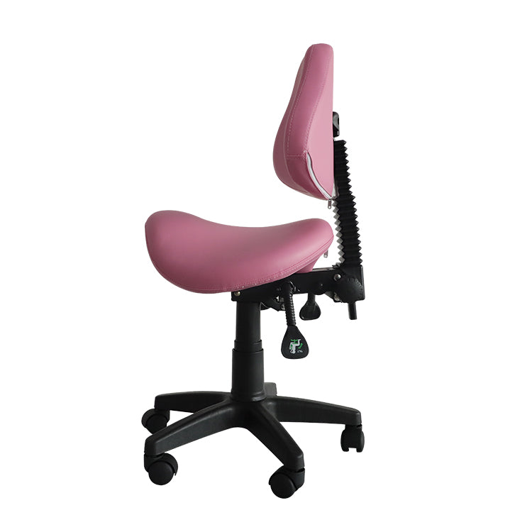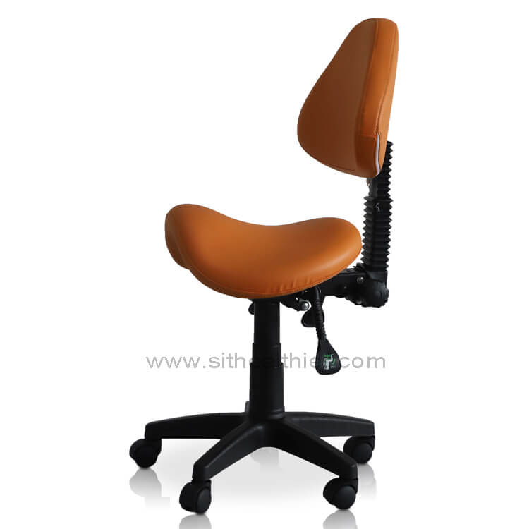Three-way adjustable saddle stool with backrest. Reinforced nylon wheel casters for extra stability and easy-rolling on even surfaces. High density and high resilience molded foam seating cushion coated with premier 100% PU leather, which is water & oil proof, abrasion-resistant, easy to clean. Perfect for a dentist, dental hygienists, dental operators, medical surgeon, guitar player, tattoo artist, hairstylist, sewing machine operator, home office professional, student, physiotherapist, massage therapist, computer operator, and anyone who works in a seated position.