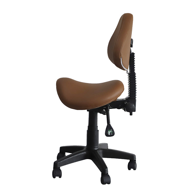 Three-way adjustable saddle stool with backrest. Reinforced nylon wheel casters for extra stability and easy-rolling on even surfaces. High density and high resilience molded foam seating cushion coated with premier 100% PU leather, which is water & oil proof, abrasion-resistant, easy to clean. Perfect for a dentist, dental hygienists, dental operators, medical surgeon, guitar player, tattoo artist, hairstylist, sewing machine operator, home office professional, student, physiotherapist, massage therapist, computer operator, and anyone who works in a seated position.